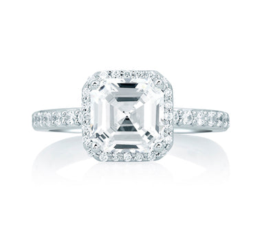 Deco Tower Halo Engagement Ring with Asscher Cut Diamond Center