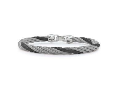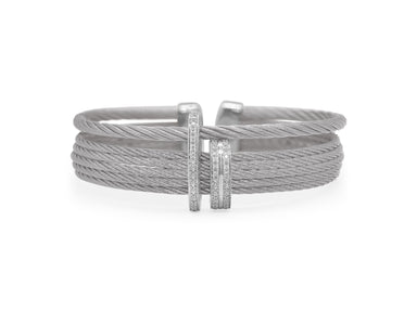 Grey stainless steel cable 6-row cuff with triple arch over diamond twists. 0.35 total carat weight of diamonds set in 18 karat white gold. Cable m...