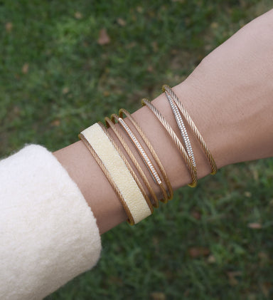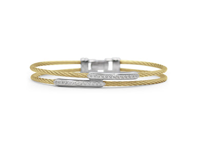 Yellow stainless steel cable 4-row cuff with double arch over diamond twists. 0.19 total carat weight of diamonds set in 18 karat white gold. Cable...
