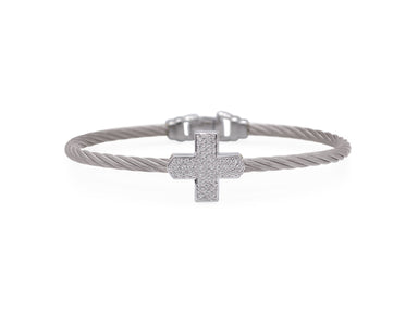 Grey stainless steel cable bracelet with cross diamond station. 0.38 total carat weight of diamond set in 18 karat white gold. Pull back clasp. Cab...