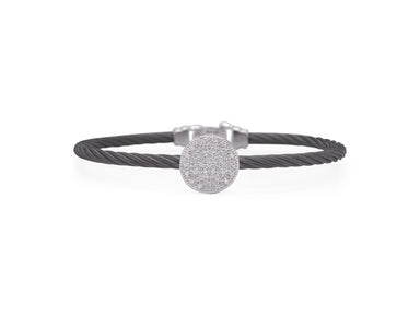 Grey stainless steel cable bracelet with square diamond station. 0.30 total carat weight of diamonds set in 18 karat white gold.Pull back clasp. Ca...