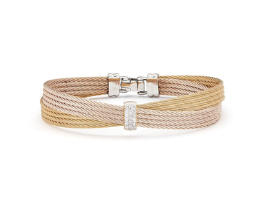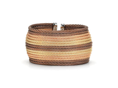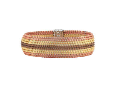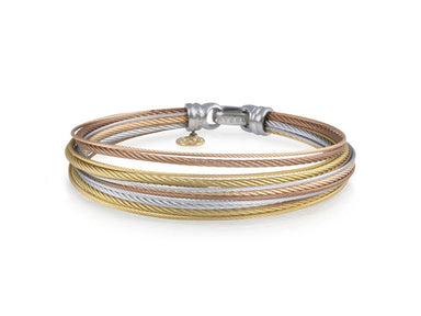 Alor Yellow cable, rose cable and bronze cable 10 row (2) 2.5mm & (8) 2mm, 18 karat Yellow Gold with stainless steel. Imported.