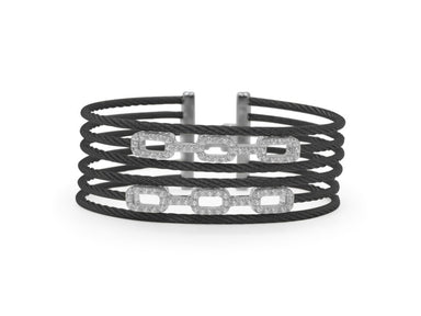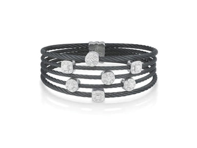 Alor Black cable 5 row (2) 2.5mm & (3) 2.0mm, 18 karat White Gold, 0.32 total carat weight Diamonds and stainless steel. Imported.