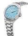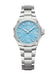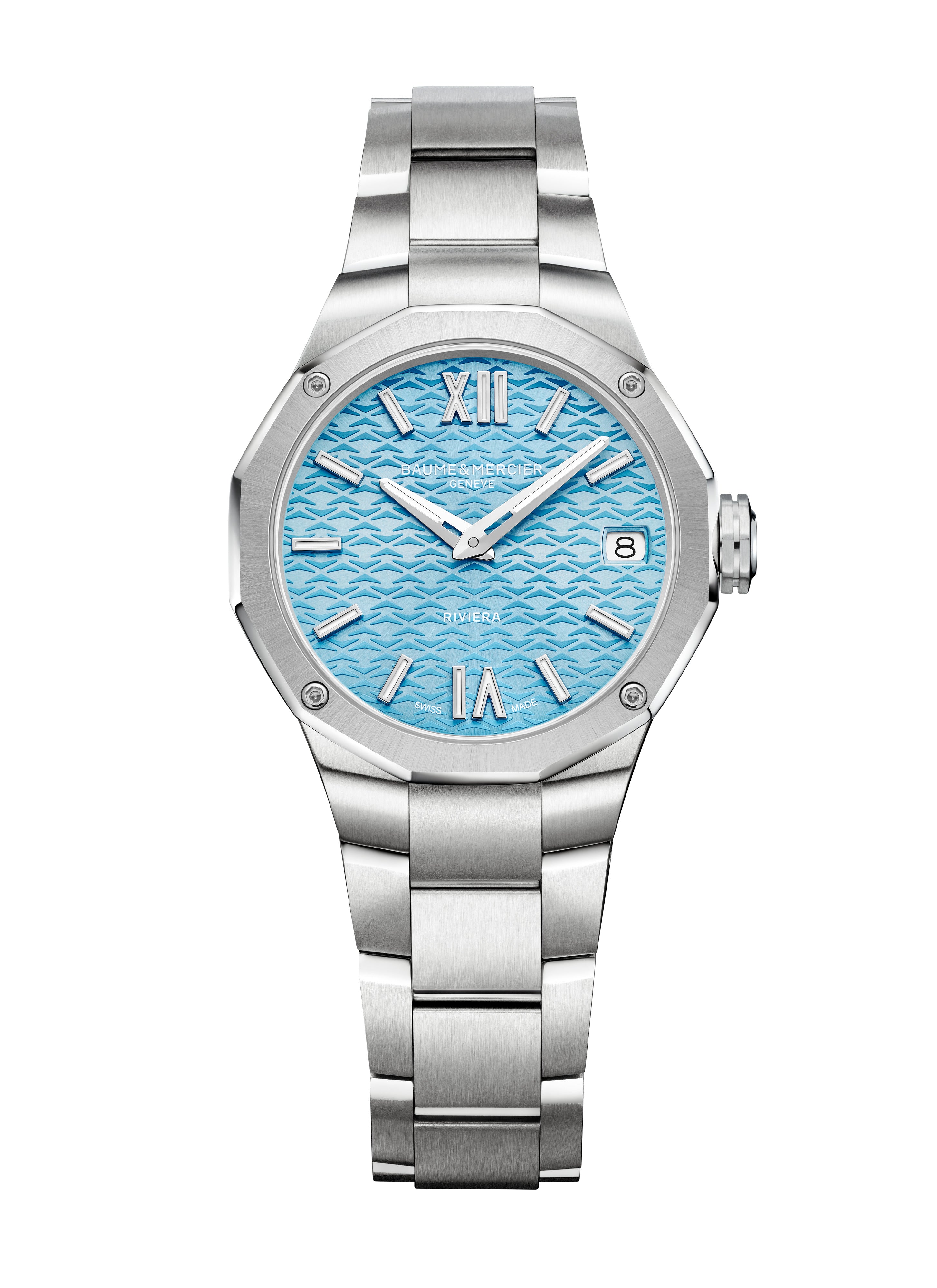 The Riviera 10811 is adorned with a sun satin-finished light blue dial and transparent waves decor with riveted rhodium plated Roman numerals and indexes coated with white Superluminova. It features a dodecagonal polished and satin-finished stainless steel case with an octogonal free crown with Phi logo embossed. The interchangeable stainless-steel bracelet features a reliable system for tool-free changes.