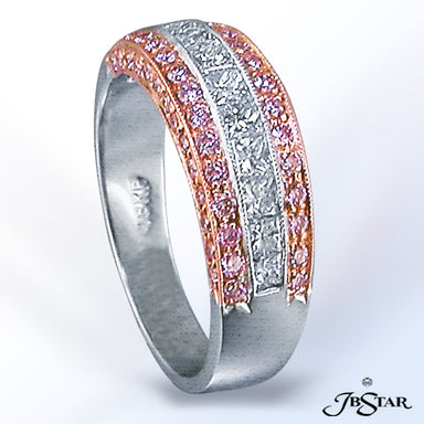 JB STAR PLATINUM AND 18K PINK DIAMOND BAND HANDCRAFTED WITH CAREFULLY MATCHED PRINCESS-CUT DIAMONDS IN CENTER CHANNEL WITH AN EDGE AND PROFILE OF P...