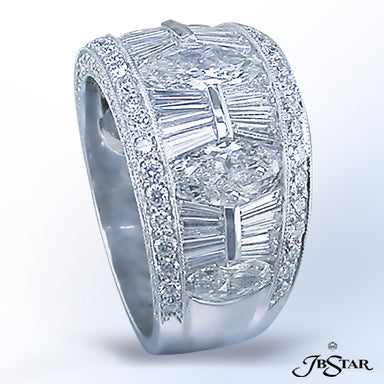 JB STAR PLATINUM DIAMOND WEDDING BAND HANDCRAFTED WITH A CENTER CHANNEL OF PERFECTLY MATCHED MARQUISE DIAMONDS AND TAPERED BAGUETTES EDGED WITH MIC...