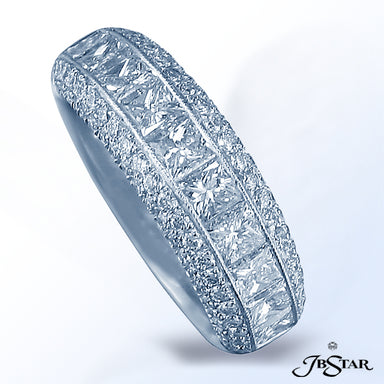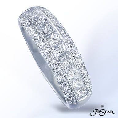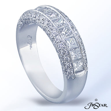JB STAR PLATINUM DIAMOND WEDDING BAND HANDCRAFTED WITH 10 STUNNING PRINCESS DIAMONDS WITH MICRO PAVE PROFILE. DIAMONDS: PRINCESS 1.30 CT. TW.; ROUN...