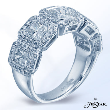 JB STAR PLATINUM WEDDING BAND HANDCRAFTED WITH 5 BEZEL-SET RADIANT DIAMONDS, EACH EMBRACED BY MICRO PAVE. DIAMONDS: RADIANT 2.30 CTW; ROUND 0.45 CTW