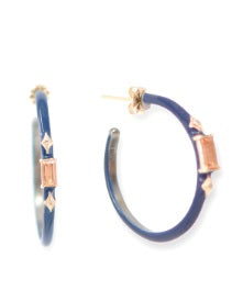 14k Rose Gold and Grey Sterling Silver 25mm Dark Blue enamel huggie with crivellis, Peach Imperial Topaz baguette and champagne diamonds.