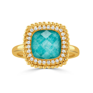 28 DIAMONDS = .14CT CLEAR QUARTZ OVER AMAZONITE = 3.33CT 14 MM FINGER SIZE: 6.5 Doves Paloma jewelry is renowned for its elegance and sophisticati...