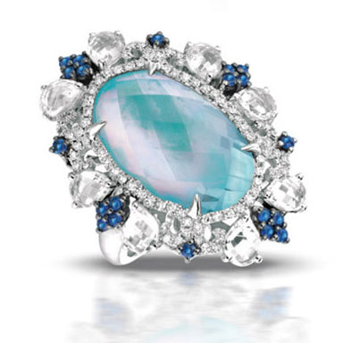 (0)Make the escape to St. Tropez. A fresh take on a classic color, blending natural Arizona turquoise, white mother of pearl and white topaz.