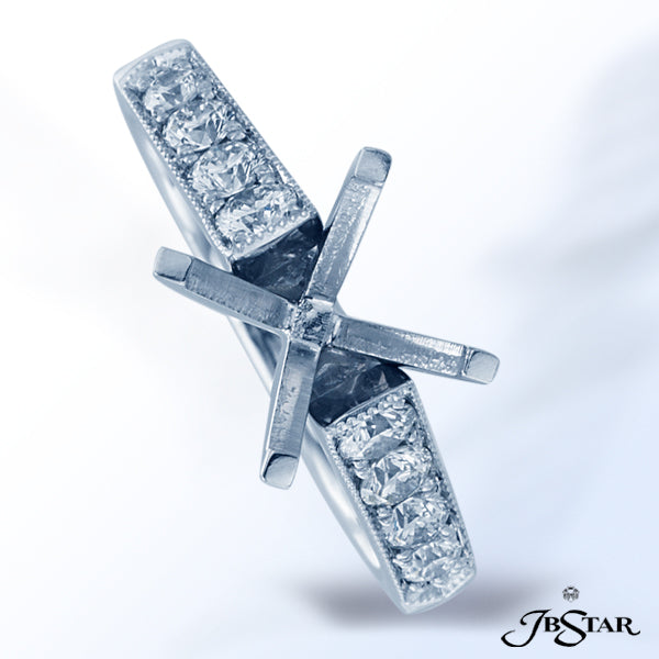 JB STAR PLATINUM DIAMOND SEMI-MOUNT HANDCRAFTED WITH 8 PERFECTLY MATCHED ROUND DIAMONDS IN SHARED-PRONG SETTING WITH MILLEGRAIN EDGE.