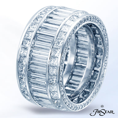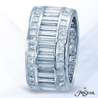 JB STAR PLATINUM DIAMOND ETERNITY BAND HANDCRAFTED WITH STRAIGHT BAGUETTES FRAMED BY PRINCESS-CUT DIAMONDS IN CHANNEL SETTINGS WITH PAVE EDGE. DIAM...