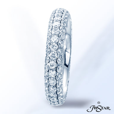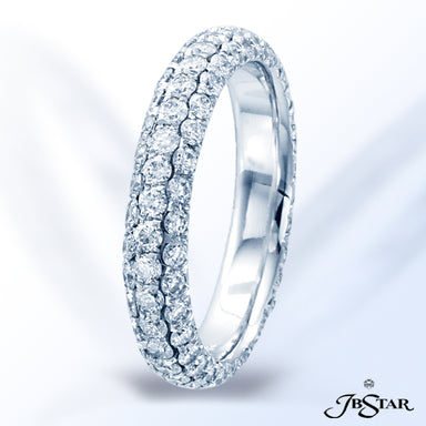 JB STAR THIS EXQUISITE ETERNITY BAND FEATURES THREE ROWS OF PERFECTLY MATCHED ROUND DIAMONDS, INDIVIDUALLY SET IN PURE PLATINUM. DIAMONDS: ROUND 1....