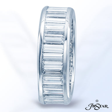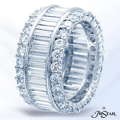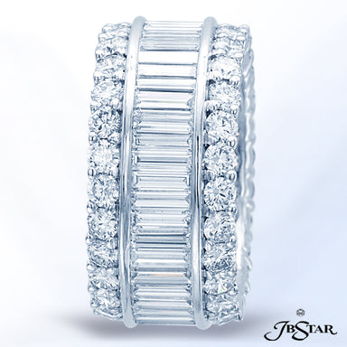 JB STAR PLATINUM ETERNITY DIAMOND BAND HANDCRAFTED WITH STRAIGHT BAGUETTES SET IN A CHANNEL WITH ROUND DIAMOND PAVE. DIAMONDS: STRAIGHT BAGUETTE 3....