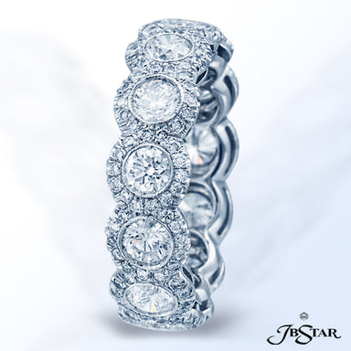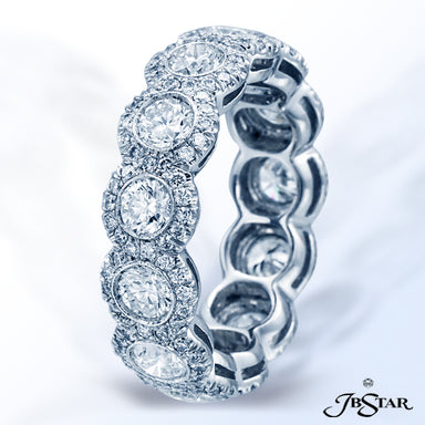 JB STAR DIAMOND ETERNITY BAND WITH 13 BEZEL-SET BRILLIANT ROUND DIAMONDS EACH INDIVIDUALLY ENCIRCLED WITH PAVE AND HANDCRAFTED IN PLATINUM. DIAMOND...