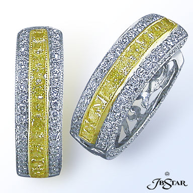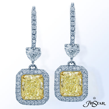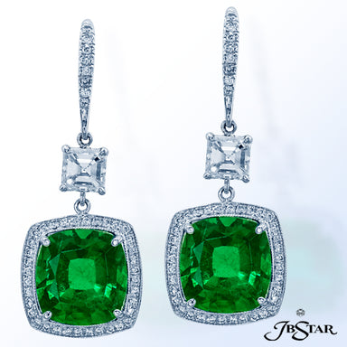 JB STAR PLATINUM SAPPHIRE AND DIAMOND EARRINGS WITH 5.05 CTW OVAL BLUE SAPPHIRES SUSPENDED FROM PRINCESS-CUT DIAMONDS AND ACCENTED WITH PAVE. CENTE...