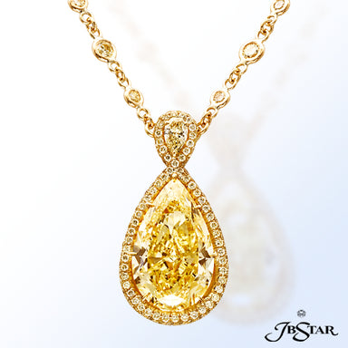 JB STAR GORGEOUS FANCY YELLOW DIAMOND PENDANT FEATURING A MAGNIFICENT 9.02CT PEAR-SHAPE FANCY YELLOW DIAMOND EDGED WITH ROUND FANCY YELLOW DIAMOND PAVE IN 18KY