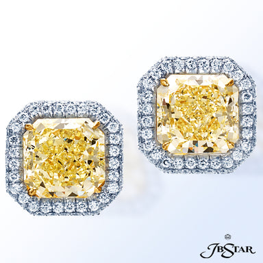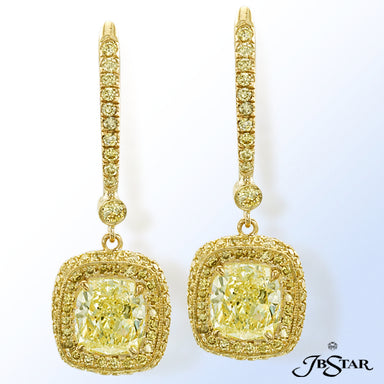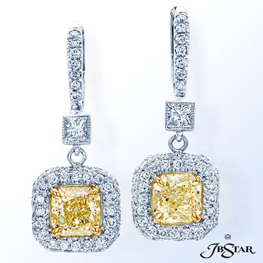 JB STAR NATURAL FANCY YELLOW DIAMOND EARRINGS HANDCRAFTED WITH PRINCESS-CUT FY DIAMONDS SET IN A CEN