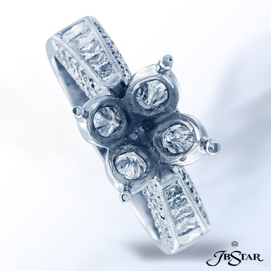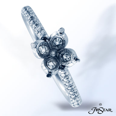 JB STAR DIAMOND AND PLATINUM SEMI-MOUNT HANDCRAFTED WITH OUR DIAMOND ROSE SETTING OF 4 MARQUISE DIAMONDS TO NESTLE YOUR DIAMOND CENTER, SUPPORTED B...