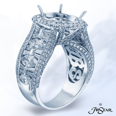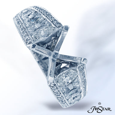 JB STAR PLATINUM DIAMOND SEMI-MOUNT HANDCRAFTED WITH CAREFULLY MATCHED MARQUISE, ROUND AND TRAPEZOID DIAMONDS IN CENTER CHANNEL, EDGED IN MICRO PAV...