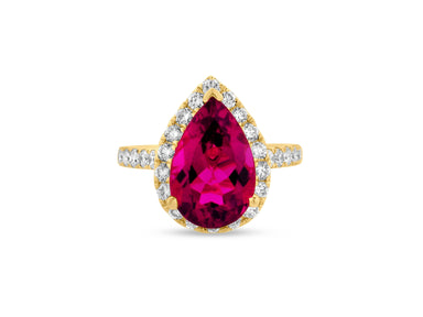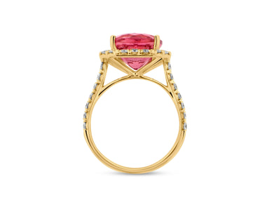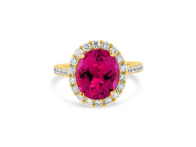 Our Prive' Collection Custom Made Color Stone Ring with 4.28ct A+ Pink Tourmaline surrounded by 1.03ct VS/ SI - G Natural Diamonds.
