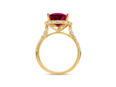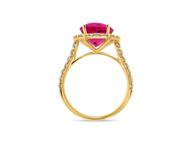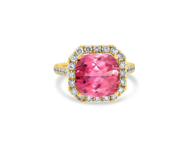 Our Prive' Collection Custom Made Color Stone Ring with 3.91ct A+ Pink Tourmaline surrounded by .88ct VS/ G Natural Diamonds.