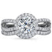 Your hand-picked center stone will be surrounded by a halo of brilliant round white diamonds in this 18k white gold bridal set that features an engagement ring that is dripping in over sixty brilliant