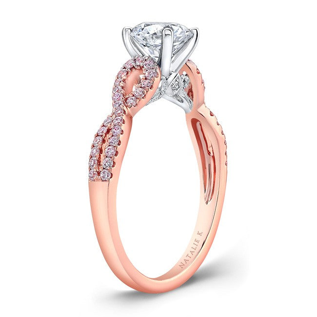 Fifty pink diamonds sparkle along the twisted 18K rose gold shank of this dazzling a four prong center mounting engagement ring.