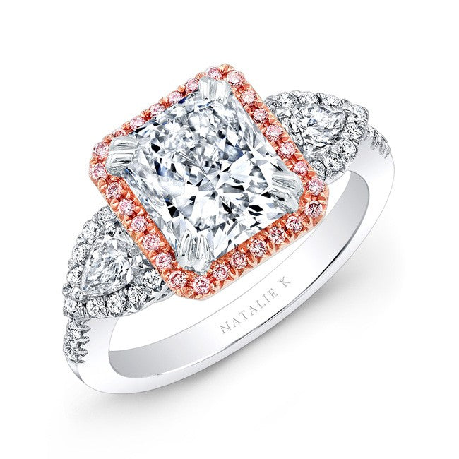 A white diamond sits in a rose gold diamond halo with pear shaped side stones in this diamond engagement ring.