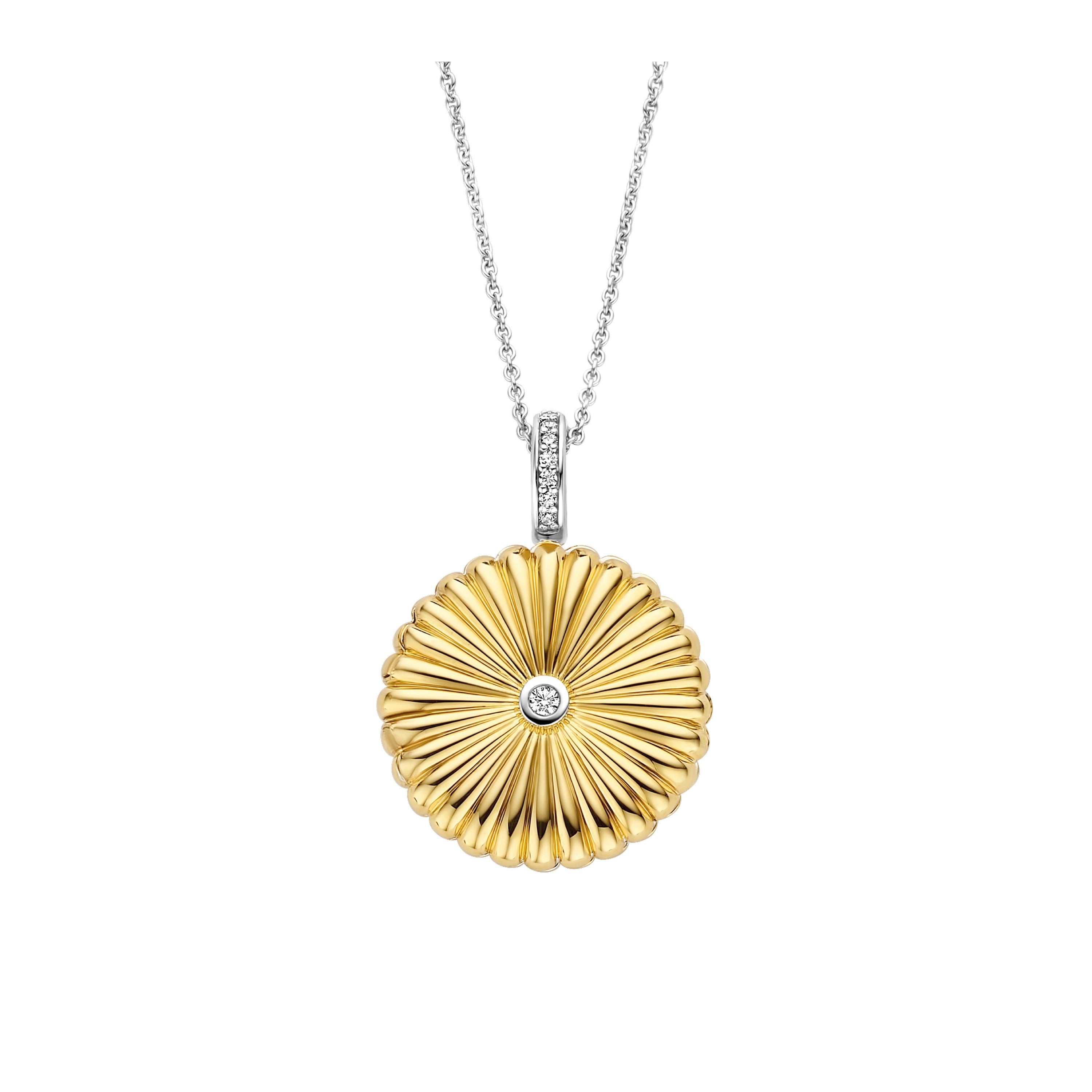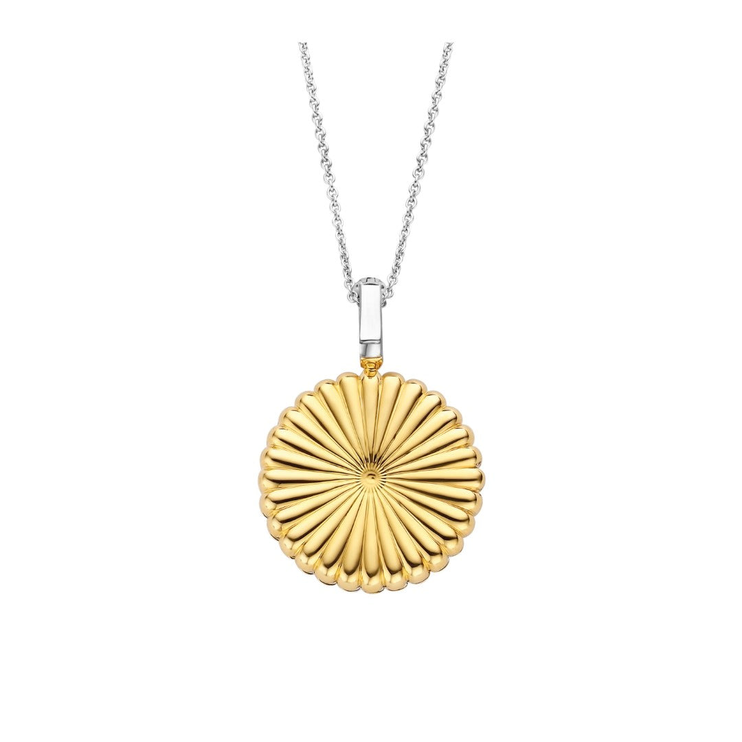 This TI SENTO - Milano gold-plated silver locket pendant 6797ZY has a beautiful sun shape with a white cubic zirconia at its centre. Its clip-eye is handset with a pave of shimmering white cubic zirconia. This keepsake was inspired by the rays of sun; carry its warmth with you and radiate it outward. Stow your dearest memories in this beloved open locket. The pendant, made of 925 sterling silver, comes with a fine silver chain necklace.