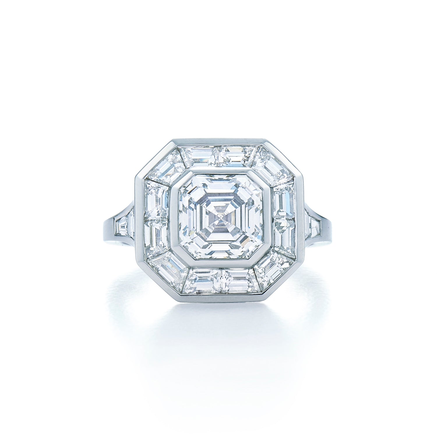 Asscher diamond ring in modern style diamond halo. Set in platinum. The Kwiat Setting, our signature setting, is open and airy and the diamond appears to float weightlessly.