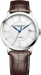 This polished steel automatic watch for men hints at the unique character of the wearer. An opaline, silver-colored dial, masculine line guilloché design, and blue hour, minute and second hands offer just the right amount of edge. The chocolate brown alligator strap and classic round 40 mm steel case enhance the luxury feel, making this an ideal timepiece for the modern professional.