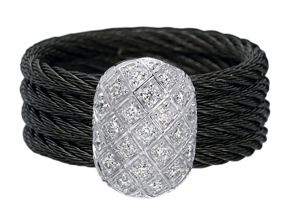 Alor Black cable 4 row 2.0mm with 18 karat White Gold and 0.19 total carat weight Diamonds, stainless steel. Imported.
