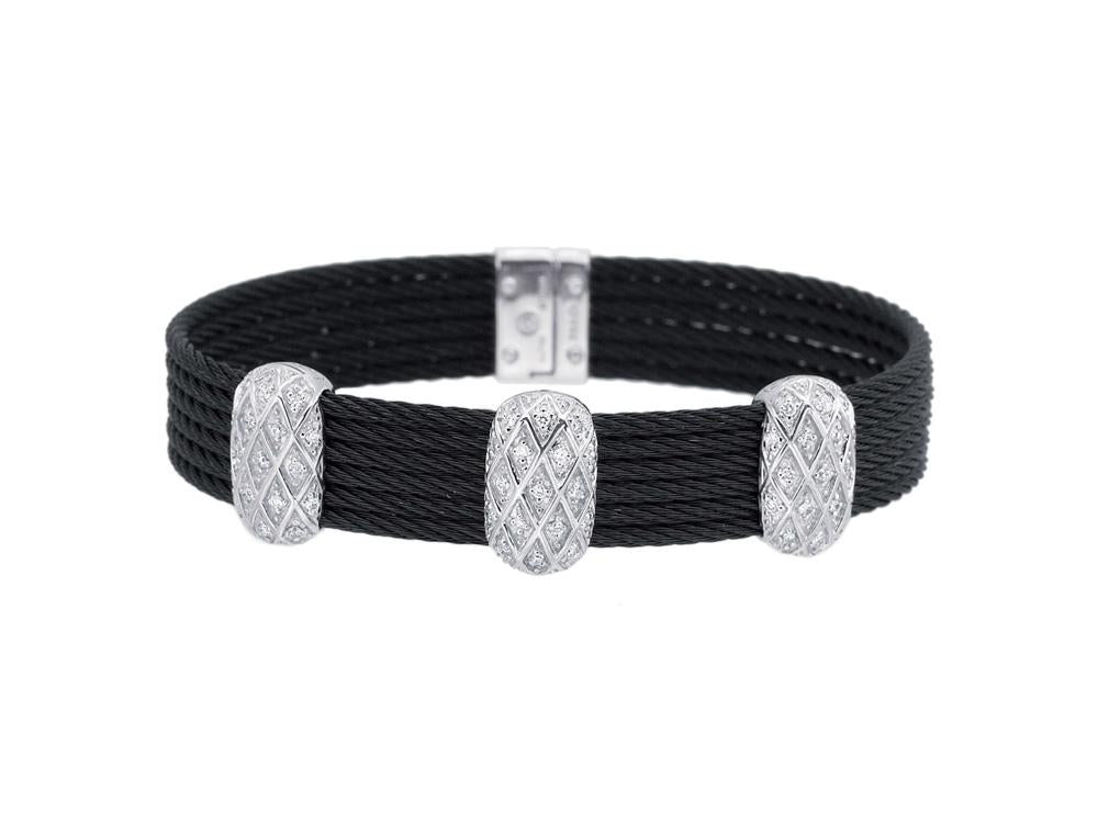 Alor 18 karat White Gold, stainless steel and black stainless steel cable 6 row 2.0mm with 0.46 total carat weight Diamonds. Imported.