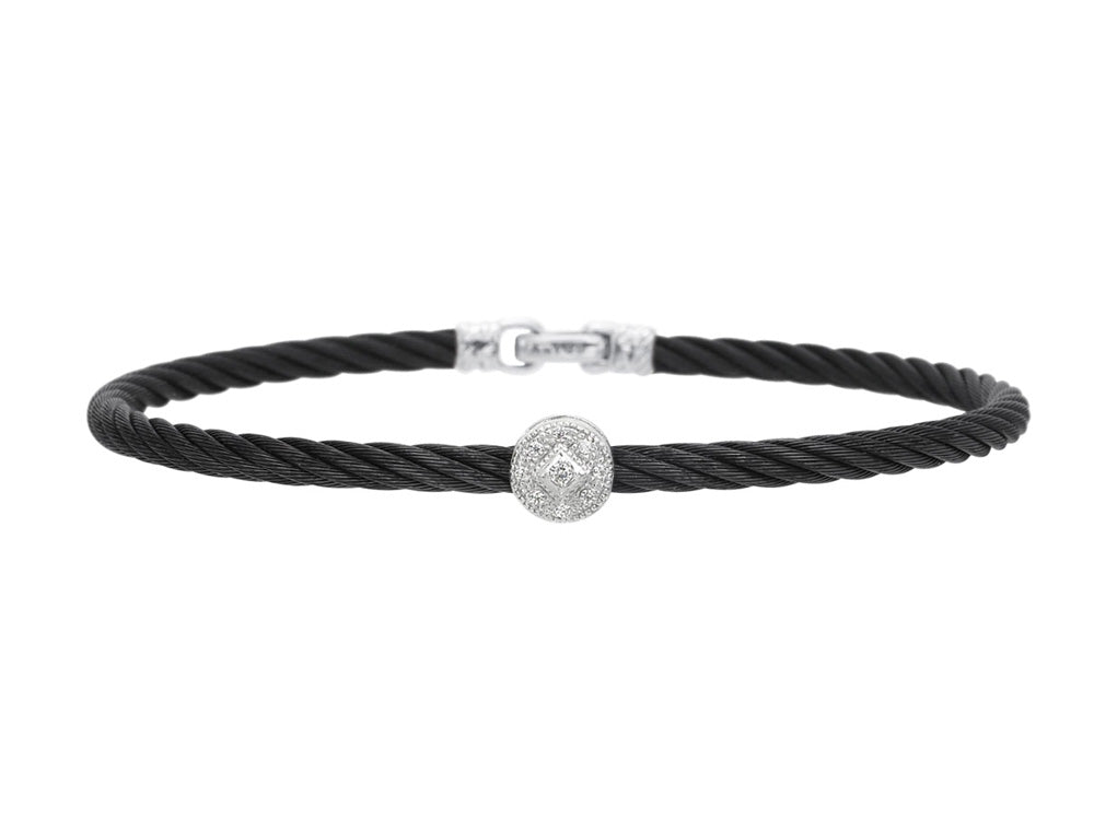 Alor 18 karat White Gold, stainless steel and black stainless steel cable 1 row 3.0 mm and Diamonds 0.05 total carat weight Diamonds. Imported.