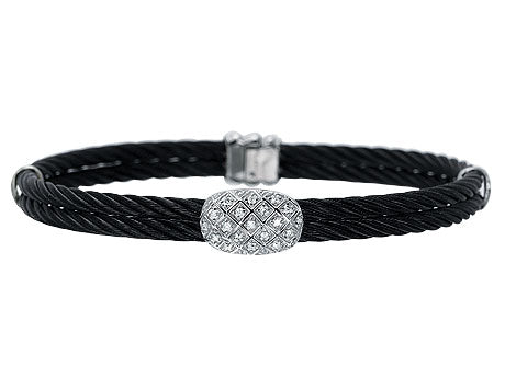 Alor 18 karat White Gold, stainless steel and black stainless steel cable 2 row 3.0mm with 0.17 total carat weight Diamonds. Imported.