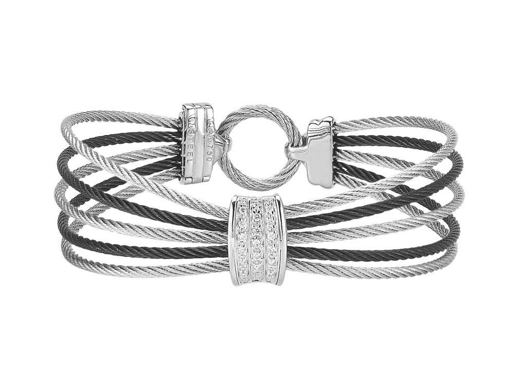 Alor 18 karat White Gold, Yellow Gold, Stainless Steel, black stainless steel cable and grey stainless steel cable 5 row 1.6mm with 0.09 total carat weight. Imported.