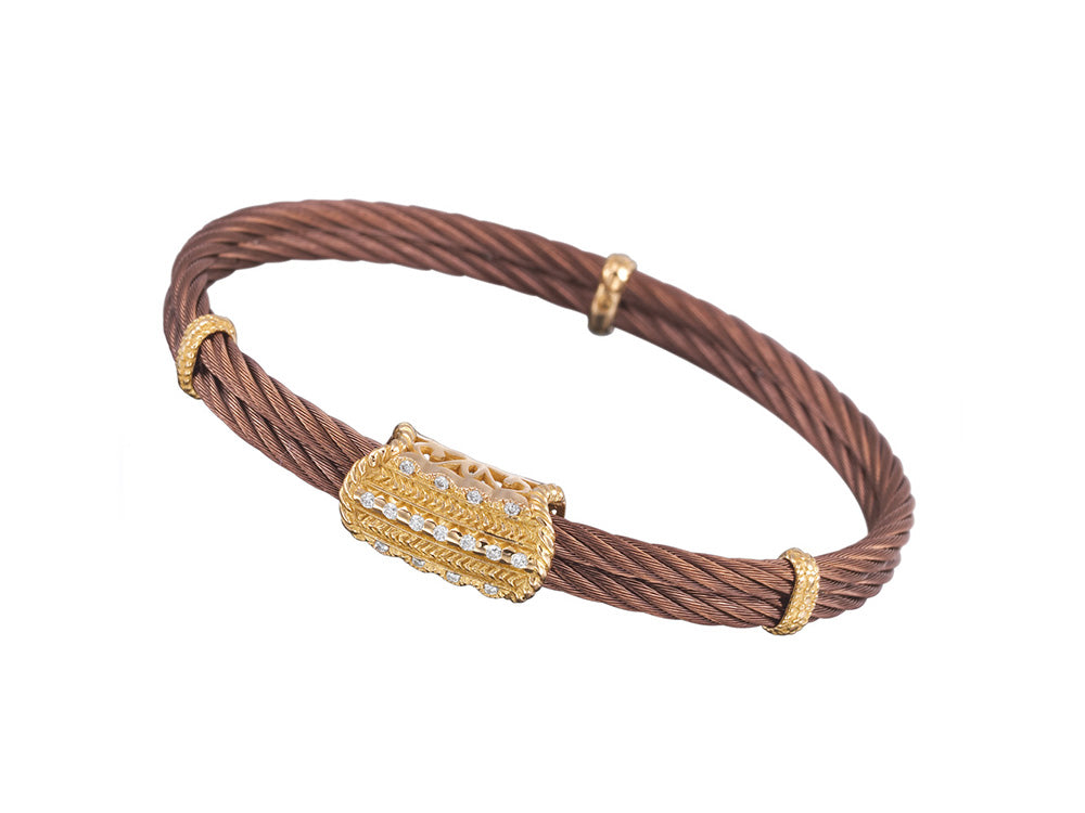 Alor Bronze cable 2 row 3.0 mm, 18 karat Petra Gold, 0.13 total carat weight Diamonds and stainless steel. Imported.