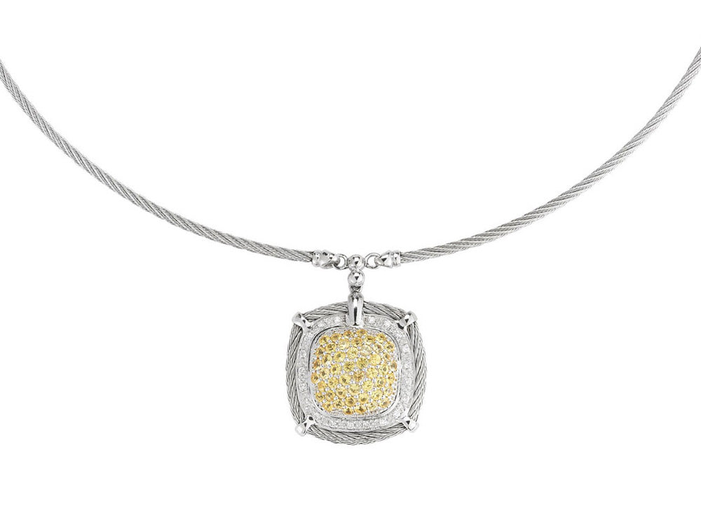 Alor 18 karat White Gold, stainless steel and Steel Cable 1 row 2.0mm with Yellow Sapphire and 0.10 total carat weight Diamonds. Imported.