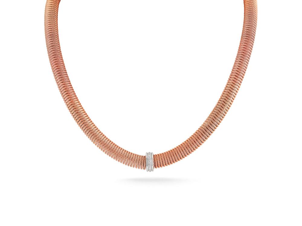 Alor Rose cable, 18 karat White Gold and Yellow Gold, 0.13 total carat weight Diamonds and stainless steel. Imported.