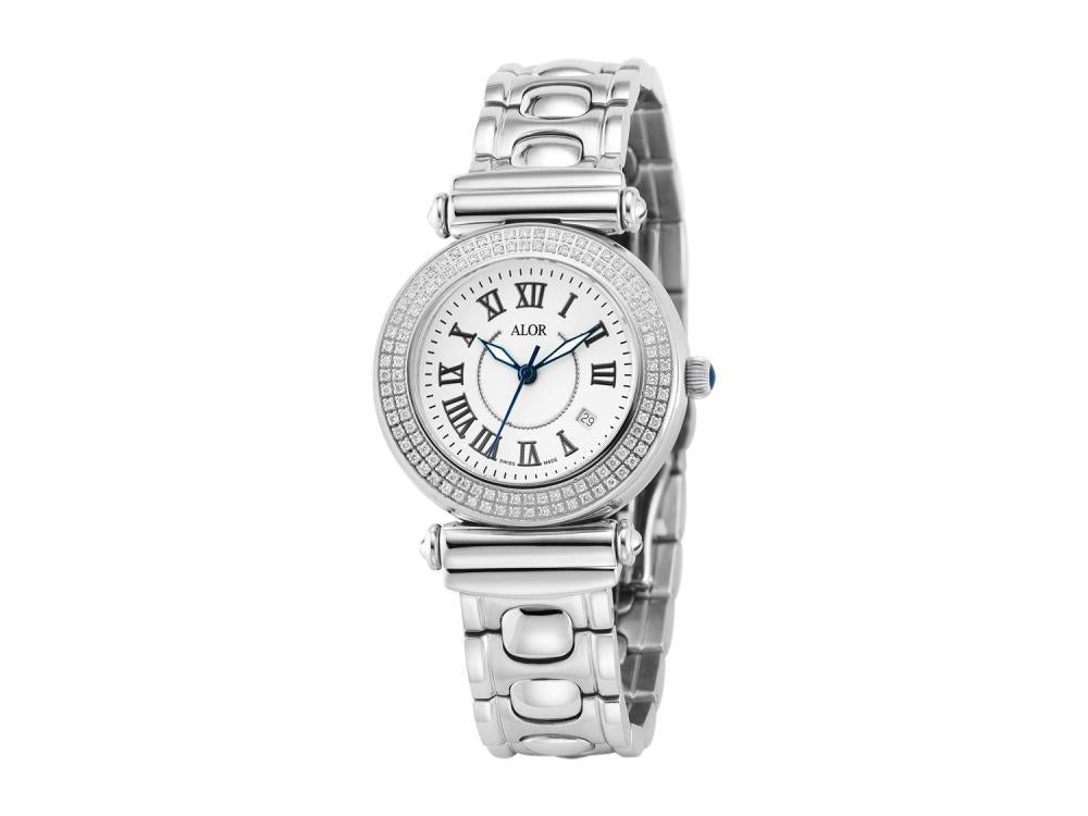 Alor 34mm Stainless Steel with Stainless Steel 0.60 total carat weight diamond bezel (120 stones), sapphire crystal and White dial with silver Roman marker dial on a stainless steel cascade bracelet. Water resistant to 3ATM.
