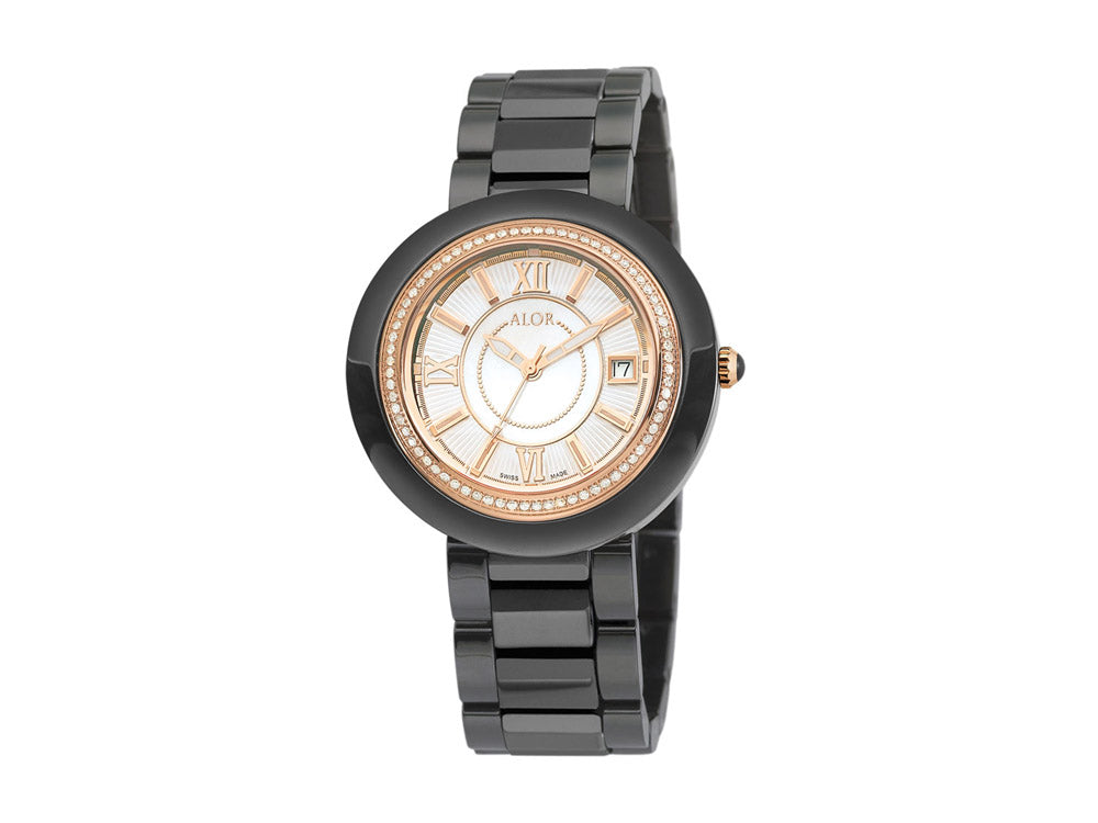 Alor 37mm Stainless Steel Swiss made with Black Ceramic/Rose PVD bezel, Cabochon Crown,double curved sapphire crystal and MOP/white dial with rose Roman markers, 0.53 total carat weight Diamonds (66 stones) on a black ceramic bracelet. Water resistant to