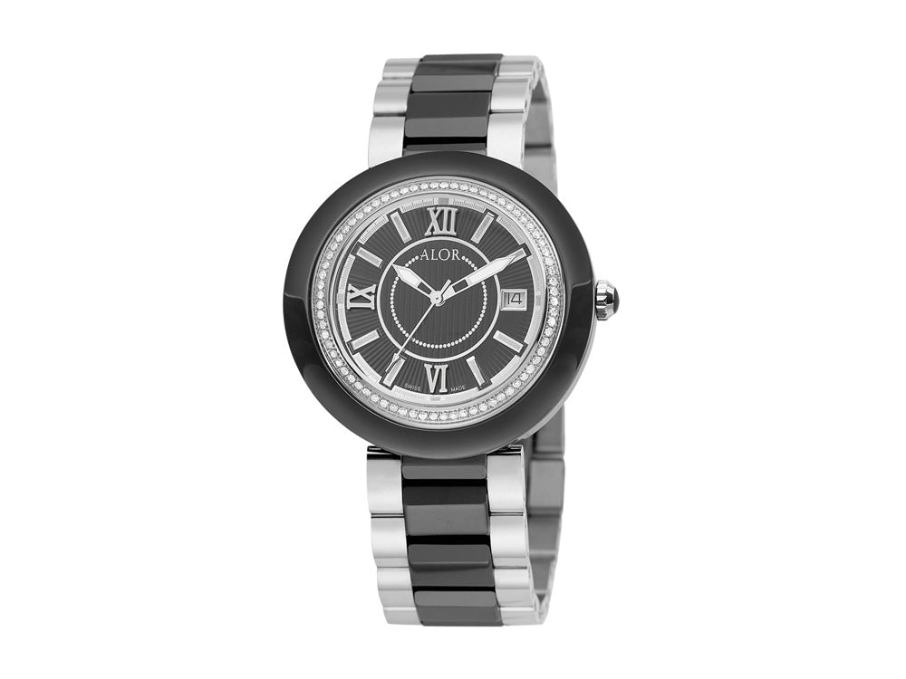 Alor 37mm Stainless Steel Swiss made with Black Ceramic/Stainless Steel bezel, Cabochon Crown, double curved sapphire crystal and black dial with silver Roman markers, 0.53 total carat weight Diamonds (66 stones) on a black ceramic/Stainless Steel bracel