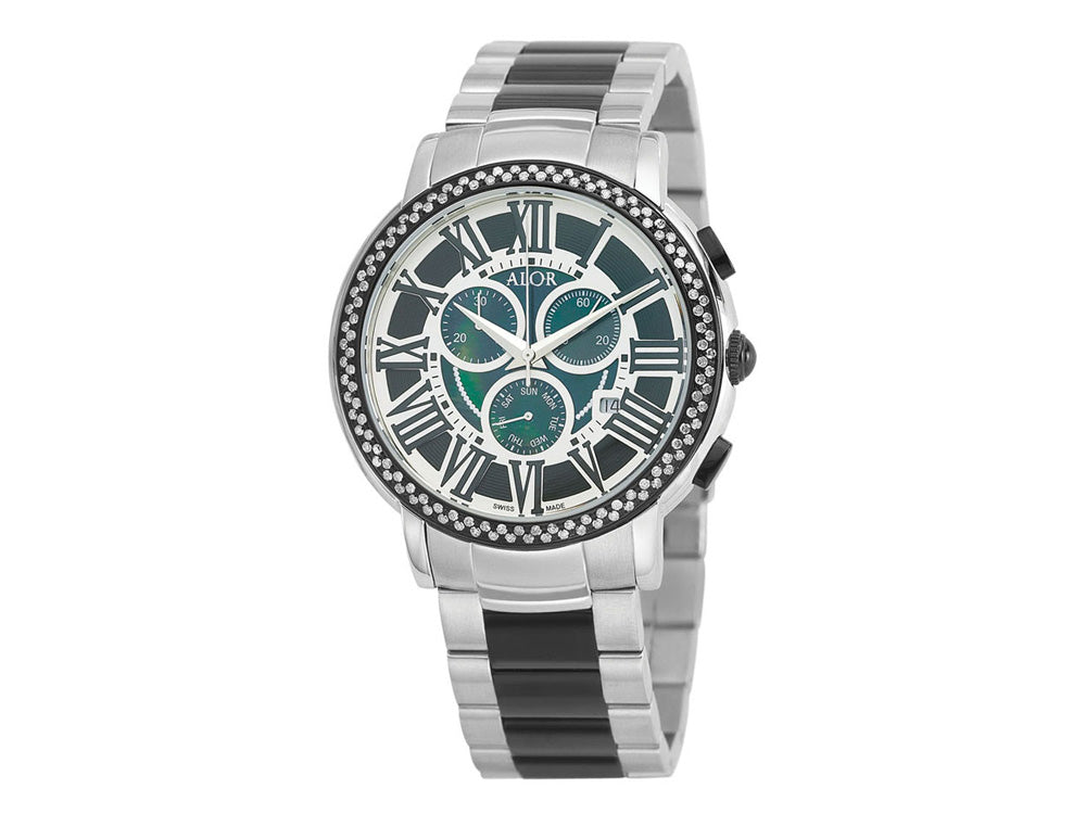 Alor 45mm Stainless Steel Swiss made with Black PVD/Stainless Steel bezel, sapphire crystal and black MOP/black and white dial with black Roman markers 1.04 total carat weight Diamonds (130 stones) on