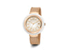 Alor 37mm Stainless Steel Swiss made with White Ceramic/Rose PVD bezel, Cabochon Crown, double curved sapphire crystal and MOP/white dial with rose Roman markers on a rose cable bracelet. Water resistant to 3ATM.