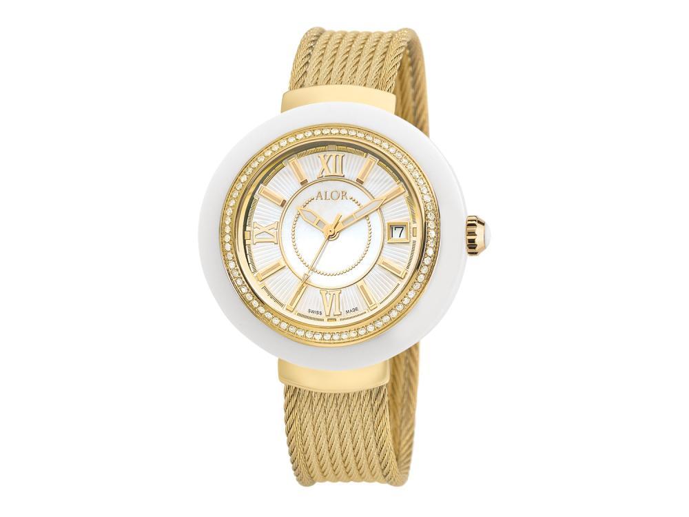 Alor 37mm Stainless Steel Swiss made with White Ceramic/Yellow PVD bezel, Cabochon Crown, double curved sapphire crystal and MOP/white dial with yellow Roman markers 0.53 total carat weight Diamonds (66 stones) on a yellow Stainless Steel cable bracelet.