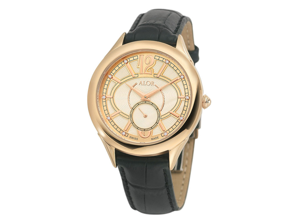 Alor 38mm Stainless Steel Swiss made with Rose PVD/Stainless Steel beze, sapphire crystal and white dial with rose Arabic markers, 0.05 total carat weight Diamonds (10 stones) on a black genuine leather strap. Water resistant to 3ATM.