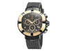 Alor 45mm Stainless Steel Rose PVD bezel, Black Chronograph dial with rose markers, curved sapphire crystal, screw down crown on a Black Rubber Strap. Water resistant to 5ATM.