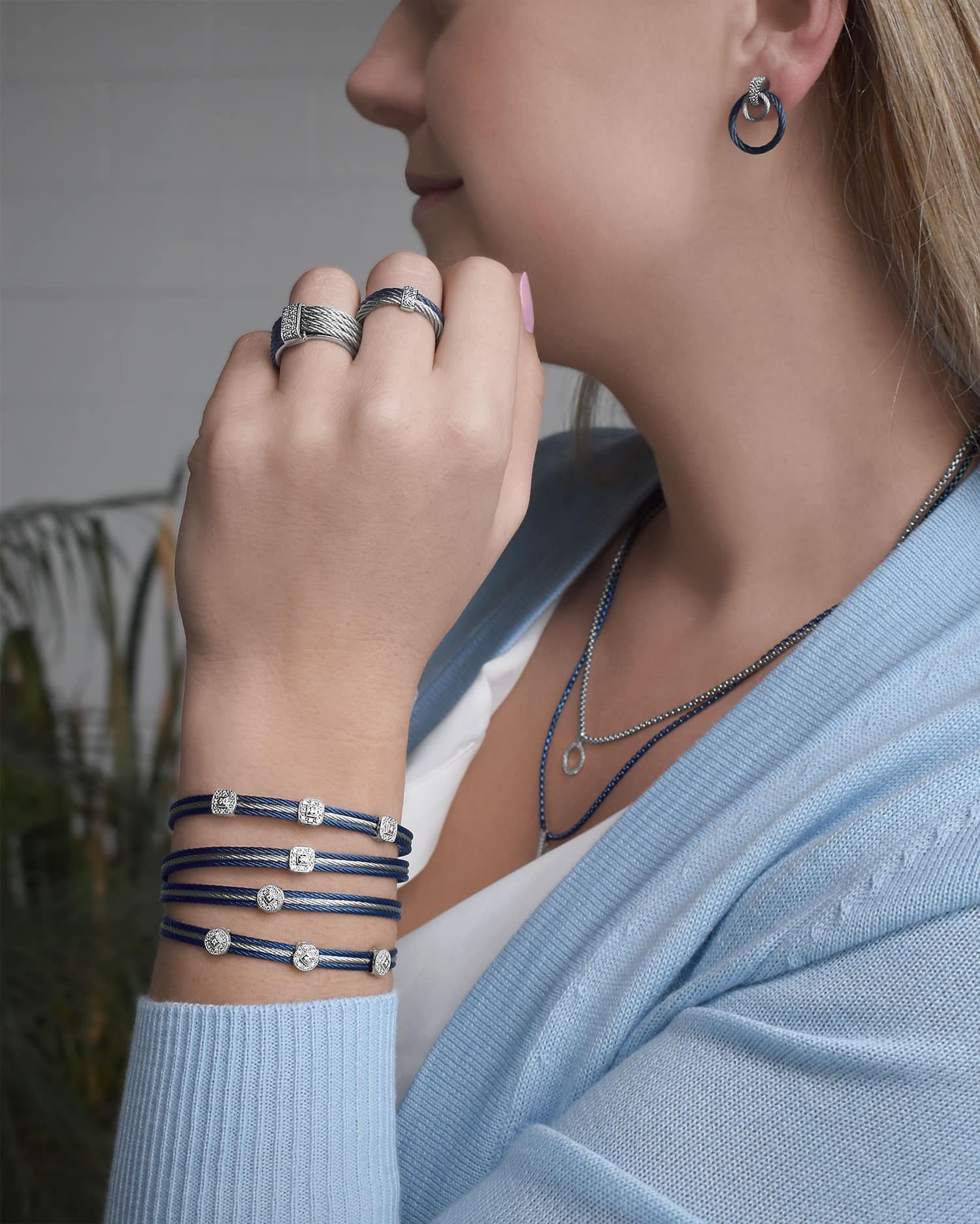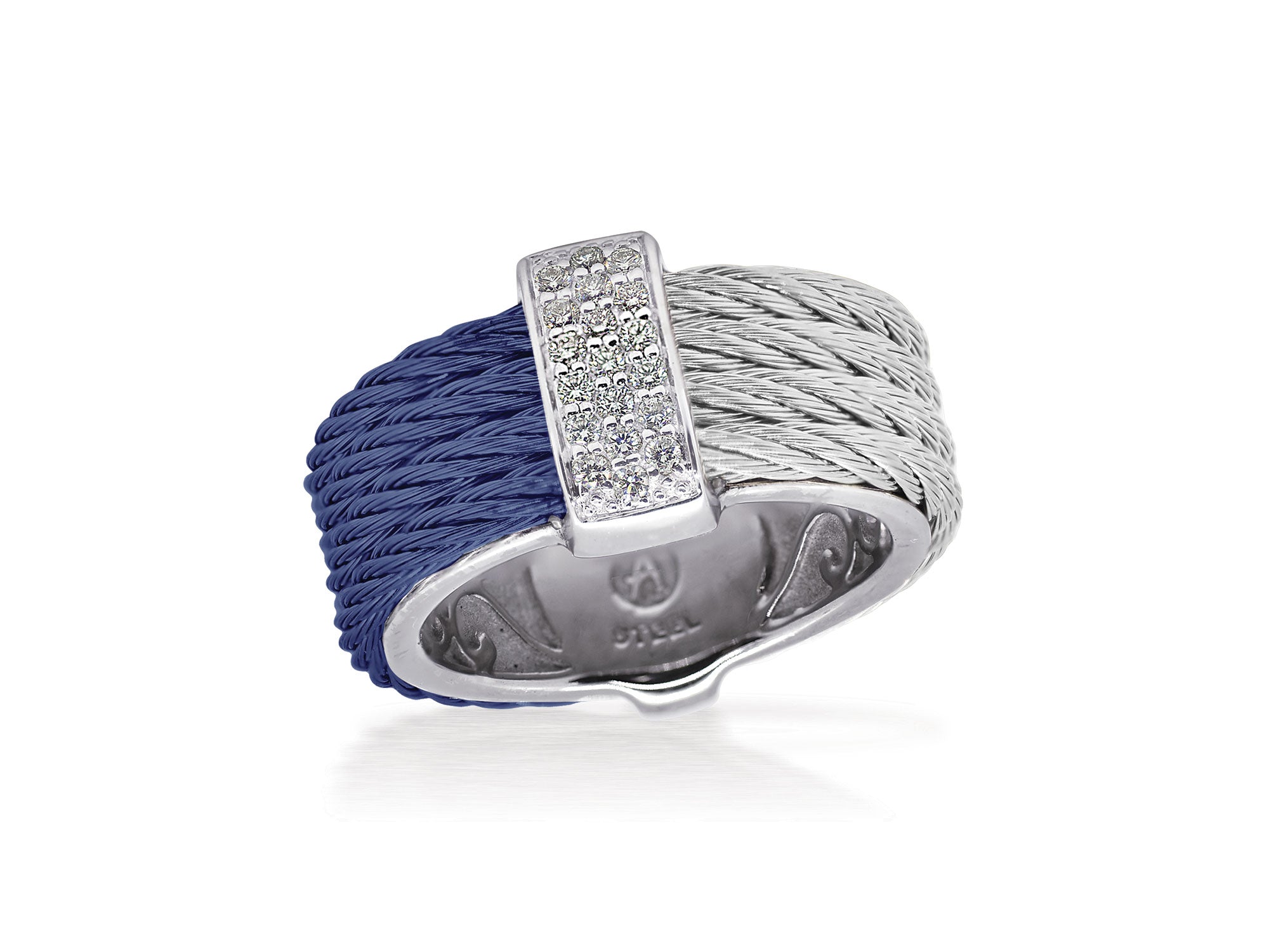 Blueberry and Grey stainless steel cable ring with 0.16 total carat weight of Diamonds set in 18 karat white gold.